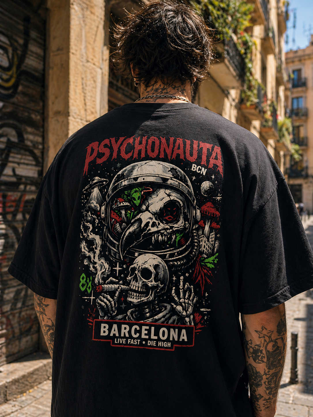 Step into the underground streets of Barcelona with the Psychonauta BCN Limited Edition Oversized T-Shirt, an exclusive drop from Fat Pigeon BCN. Designed for those who live outside the ordinary, this heavyweight black streetwear tee combines psychedelic art, rebellious energy, and authentic Barcelona culture into one standout piece.